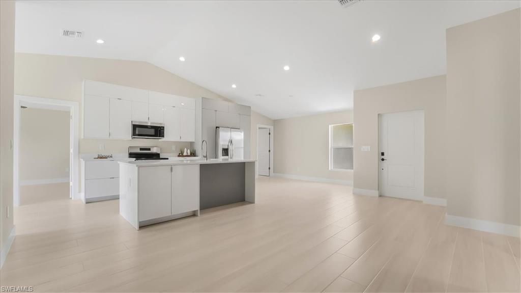 Be the first to call this home your own—brand new construction built in 2024 and never lived in. This beautiful 4-bedroom, 2-bath residence is designed for modern living and built for durability with impact-resistant windows and doors for added safety and efficiency. The open-concept layout features vaulted ceilings, recessed lighting, and tile flooring throughout, creating a bright and seamless flow through the living spaces. The striking two-tone kitchen is the centerpiece of the home, ...Be the first to call this home your own—brand new construction built in 2024 and never lived in. This beautiful 4-bedroom, 2-bath residence is designed for modern living and built for durability with impact-resistant windows and doors for added safety and efficiency. The open-concept layout features vaulted ceilings, recessed lighting, and tile flooring throughout, creating a bright and seamless flow through the living spaces. The striking two-tone kitchen is the centerpiece of the home, complete with stainless steel appliances, a large island with breakfast seating, and plenty of cabinetry for storage. The spacious owner’s suite offers a walk-in closet and a well-appointed en-suite bath designed for comfort and privacy. A full-home gutter system provides year-round protection, while the expansive backyard offers endless possibilities—perfect for adding a pool, outdoor kitchen, or creating your dream outdoor living space. Move-in ready and built with quality in mind, this home is the perfect combination of style, comfort, and functionality.